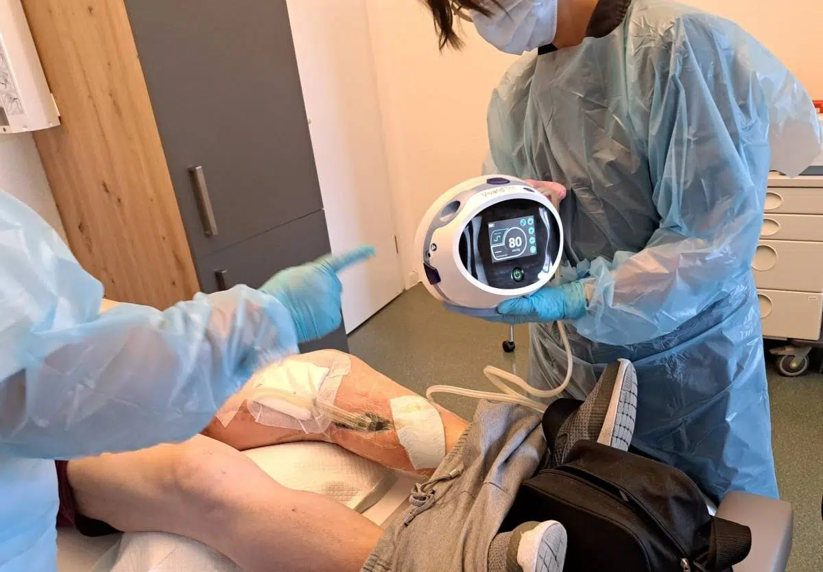 Bei besonders hartnäckigen Wunden kann die Vakuumtherapie (VAK) helfen: Eine Pumpe erzeugt Unterdruck über der Wunde und regt so die Durchblutung an. „Damit lässt sich die Therapiedauer oft halbieren“, sagt Diana Bauer. Viele Kliniken beginnen die Behandlung während des Aufenthalts. Danach kann sie ambulant fortgeführt werden – wenn ein Facharzt bereit ist, die Leistung separat mit der Kasse abzurechnen. Für bettlägerige Patientinnen und Patienten besteht die Möglichkeit einer Unterstützung durch das Homecare-Team.